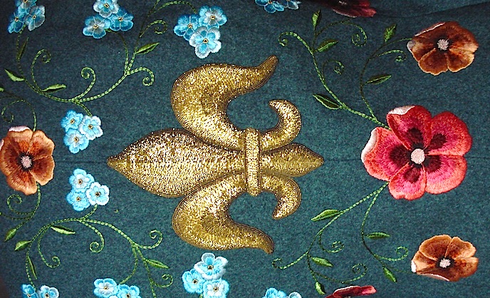 Here’s a closeup of the back. The center fleur de lis is made with metal threads, couched with silk, and padded with wool felt. The flowers are stitched with flat silk, mostly satin stitch, with some chain stitch and bullion knots. The blue forget-me-nots have metal purl threads cut into beads for their centers.