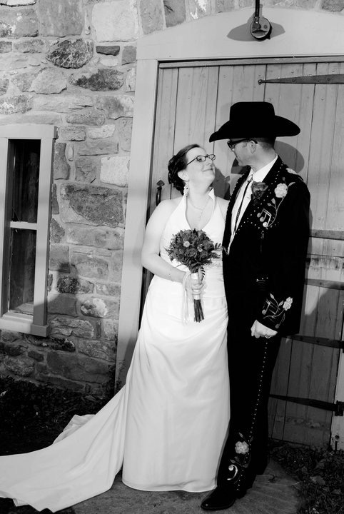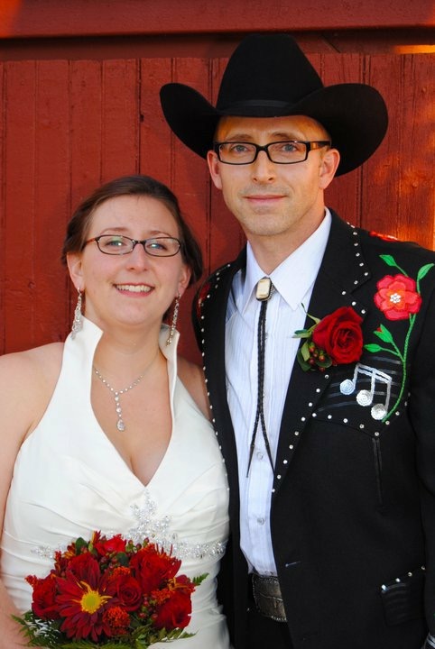 This suit was a commission for a wedding that took place on Halloween day. The groom is a talented musician and wanted a western “Nudie” suit, like the ones Nudie Cohn designed and embroidered for stage and screen. The one I designed is a floral and musical note pattern. The flowers are painted silk appliqué to match the bride’s bouquet, and the musical note design is embroidered with matte flat sequins and swarovski crystals.